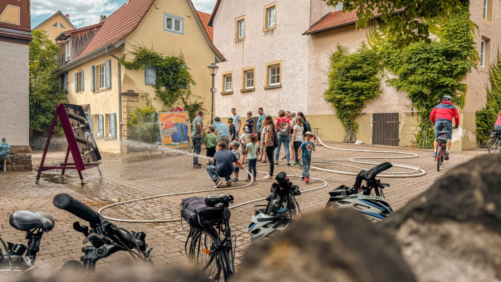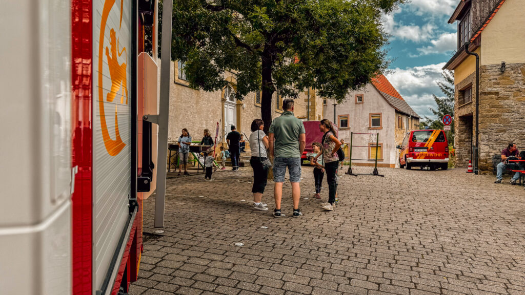So hat die Jugendfeuerwehr im Schlosshof Wasserspiele und andere Aktivitäten für Kinder angeboten, und das Besichtigen eines Feuerwehrautos von innen war ebenfalls Teil des Nachmittagsprogramms.