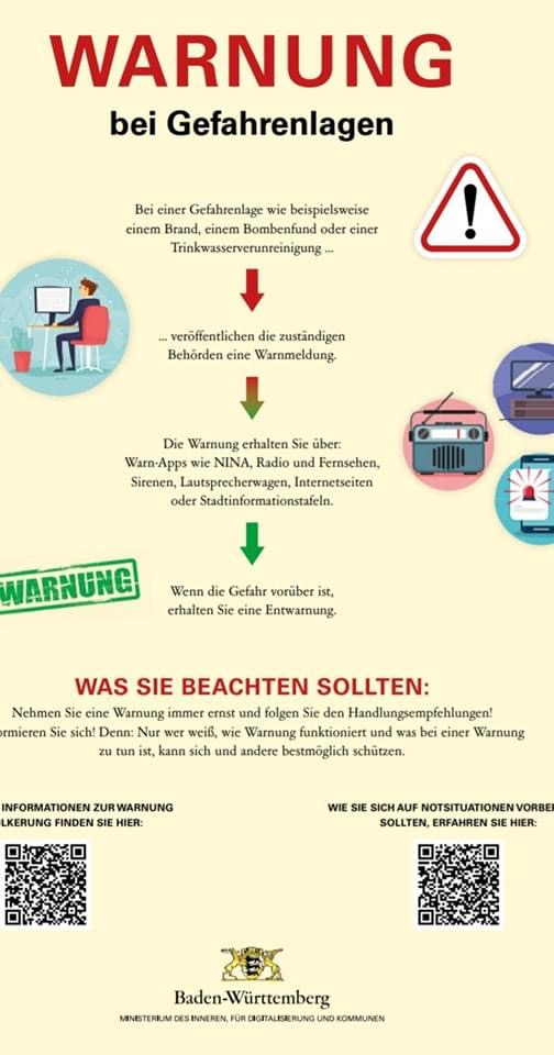 Um 11 Uhr werden die Warnkanäle auf Ebene des Bundes und der Länder sowie in den Kommunen getestet. Hierbei werden alle an das Modulare Warnsystem des Bundes angeschlossenen Warnmittel (z.B. Warn-Apps, Cell-Broadcast) ausgelöst. Auf Ebene des Landkreises Karlsruhe also auch hier in Kraichtal werden sämtliche Sirenenanlagen ausgelöst.