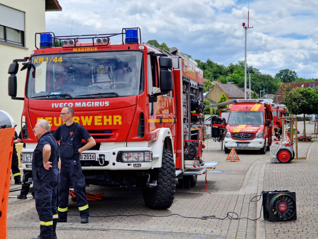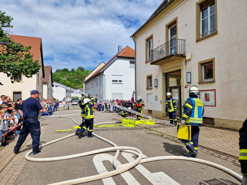 Eine Übung, wie zur Gründerzeit der Feuerwehr Kraichtal 1974, läutete mit der Sirene auf dem alten Rathaus und Signalhorn ein. Sechs Kameraden in historischer Einsatzkleidung fuhren mit dem Tragkraftspritzen-Fahrzeug der Firma Billerbeck/Münzesheim, einem VW-Bus Baujahr 1971, vor und löschten einen simulierten Brand im alten Rathaus. Ganz ohne Atemschutz und modernen Löschtechniken wurde der „Brand“, wie damals üblich, von außen gelöscht. Unter der Leitung von Reiner Friedrich hatten sich die Männer gut auf das, mittlerweile ungewohnte, Szenario vorbereitet. Ganz anders war die zweite Übung nach modernen Maßstäben. Mit dem Löschgruppenfahrzeug Lf 8/6 der Abteilung Neuenbürg führte eine Löschgruppe (bestehend aus 9 Personen) unter der Leitung von Thorsten Ockert dieselbe Übung durch. Hier ging ein Trupp unter Atemschutz mit feuerfester Einsatzkleidung und Wärmebildkamera ins Gebäudeinnere vor. Gleichzeitig wurde, mittels Leiter, ein zweiter Rettungsweg geschaffen und die Überdruckbelüftung vorbereitet. Die dritte Übung an diesem Nachmittag, der ganz im Zeichen des Blaulichtes stand, gehörte den Jugendlichen. Unter der Leitung von Philipp Burkhardt stellten die Nachwuchskräfte ihr Können unter Beweis. Gezeigt wurde ein Löschangriff mit „Wasserentnahme offenes Gewässer“, wie er bei der Abnahme der Jugendleistungsspange verlangt wird. Alle drei Übungen wurden fachkundig moderiert durch Torsten Krüger, bei denen zahlreiche Zuschauerinnen und Zuschauer den Straßenrand säumten.